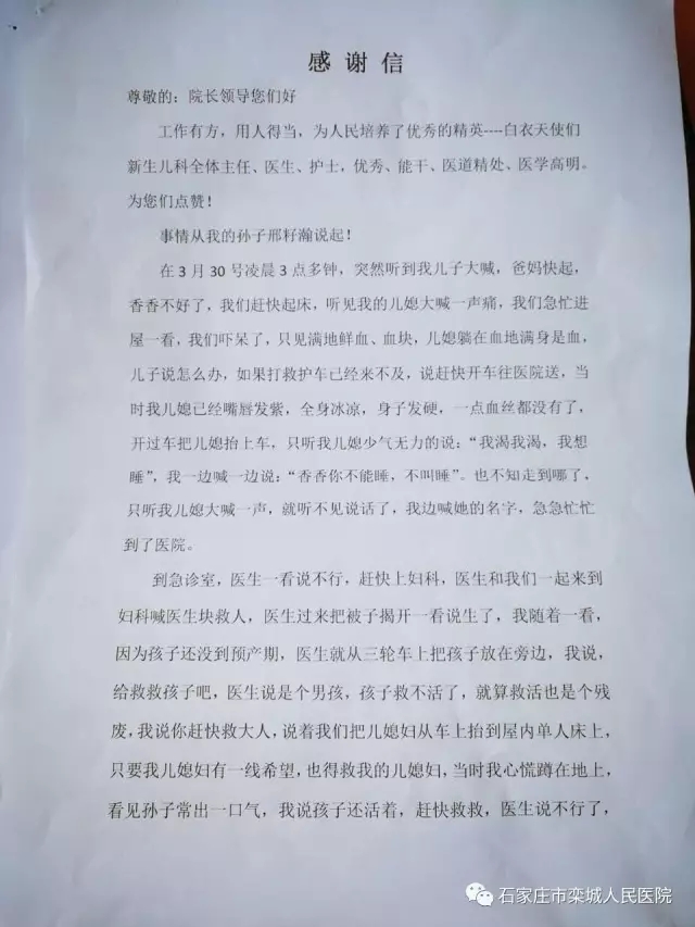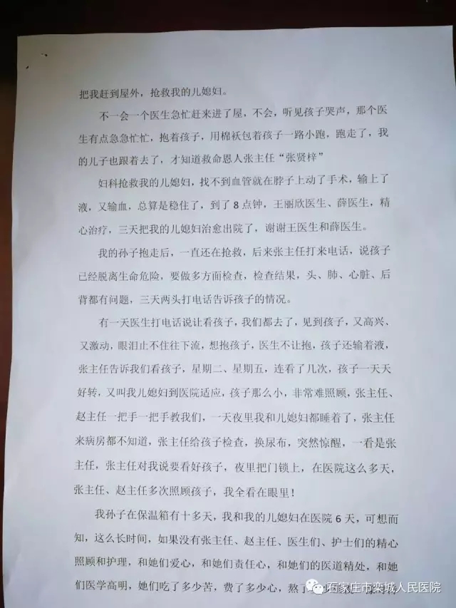 事情要从三个多月前的一天说起:侯素芳,栾城人氏,3月30日,其儿媳于家中早产大出血,送至栾城人民医院抢救,在面对母婴只能保一个的情况下家属选择了大人,在紧张的抢救过程中,新生儿科副主任张贤梓接到妇科紧急求救电话,迅速赶到妇科。发现婴儿尚有气息,她赶紧抱起婴儿送回新生儿科,同科室相关人员对婴儿进行了争分夺秒的抢救。妇科、新生儿同时与死神展开了赛跑。