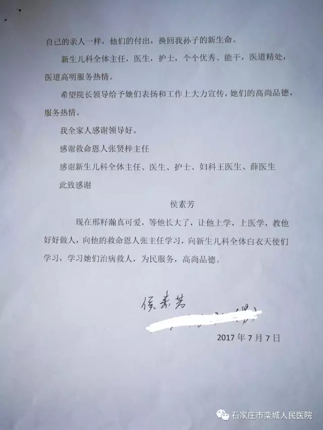 患儿名叫郝籽瀚,他的奶奶侯素芬在感谢信中留下这么一段话:孩子大了,一定让他好好学习,也让他学医,做个医生。也正是这段话,引起说者、听者的共鸣,泪不自禁。这一句简单的话语里,我们听懂了理解、尊重、感激等等很多话外的东西......。