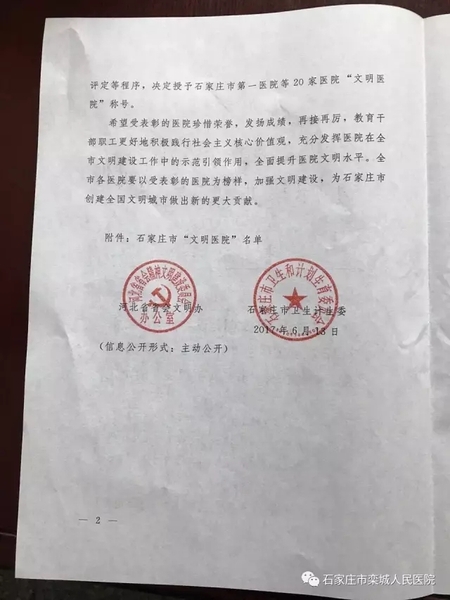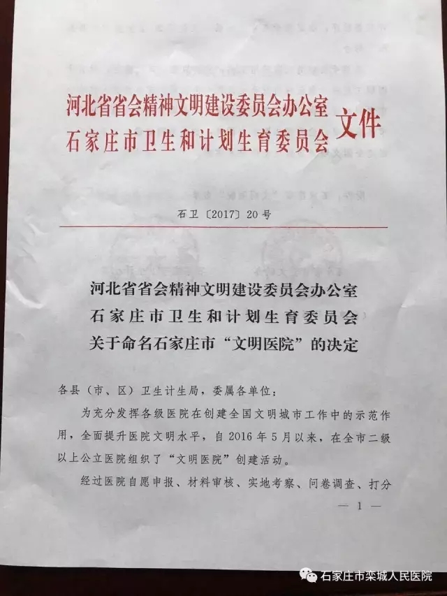 2016年5月以来,我院在石家庄市卫计委和区卫计局的领导下,开展了“文明医院”创建活动。创建活动中,医院主要领导高度重视,亲自做出批示安排此项工作;主管领导亲力亲为,指导创建工作从大处着眼,小处着手,使我院的创建工作落到了实处。各相关科室按照统一部署,在改善办公服务环境、完善便民服务设施、优化工作流程、转变服务态度、提高群众满意度等“五好”方面均取得了明显成效。同时,我院高度重视法制建设和精神文明建设,坚持标本兼治,综合治理,认真开展“九不准”专项治理工作,强化医德医风建设,为广大患者提供了良好的就医环境。经过我院自愿申报,上级材料审核、实地考察、问卷调查、打分评定等环节,近日,河北省省会精神文明建设委员会办公室和石家庄市卫生和计划生育委员会联合为包括我院在内的全市20家医院授予了“文明医院”称号。